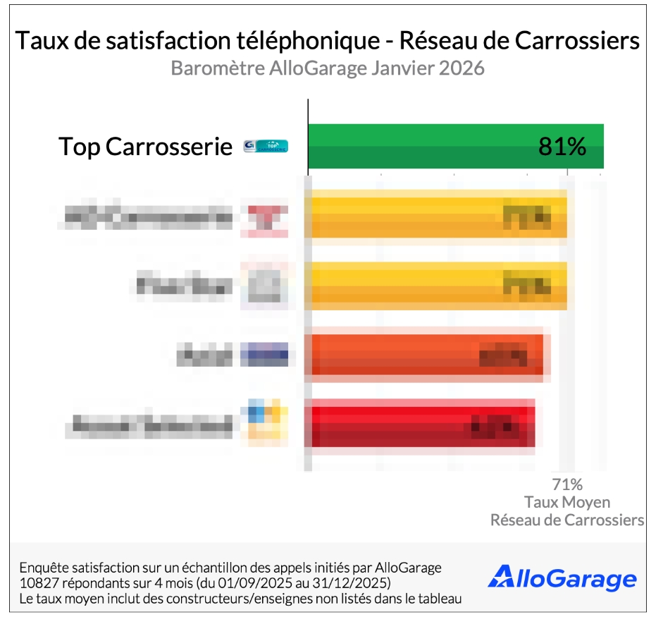 Les réseaux de carrossiers affichent également de bons résultats. Leur taux de satisfaction moyen s’élève lui aussi à 71 %. Top Carrosserie arrive en tête avec 81 %, confirmant la bonne image de ces enseignes sur la relation client par téléphone.