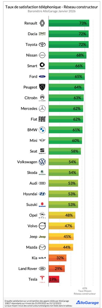 Du côté des réseaux constructeurs, la satisfaction moyenne atteint 65 %. Renault arrive en tête avec 73 %, devant Dacia et Toyota, à 72 %. À l’autre extrémité du classement, Tesla affiche un taux très bas, à 19 %, loin derrière Land Rover (29 %) et Kia (32 %).