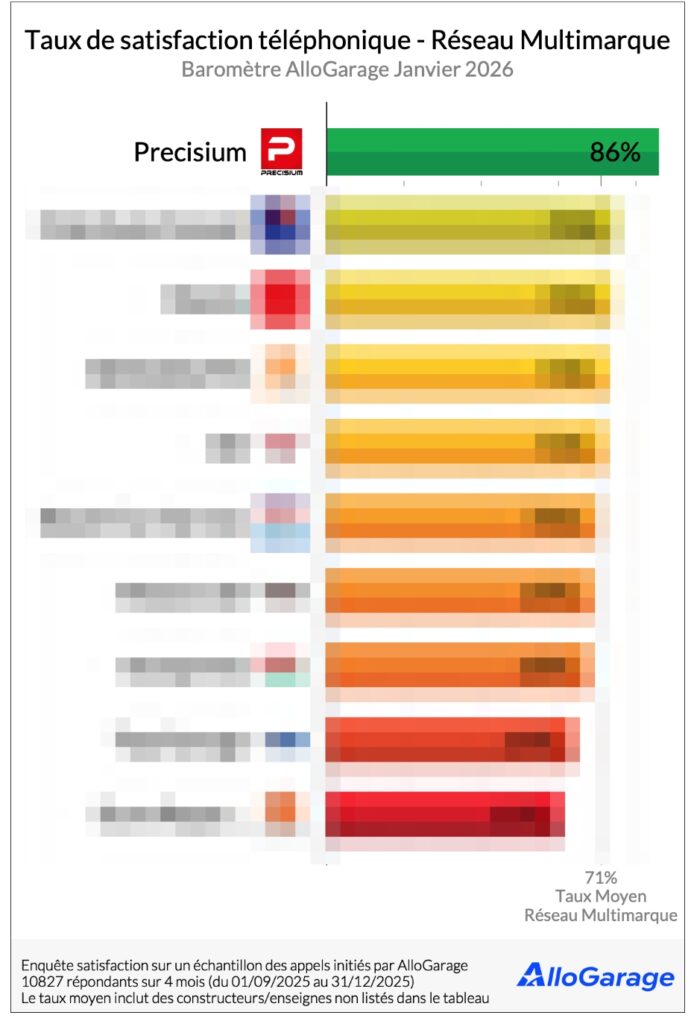 Les réseaux multimarques restent les mieux notés du baromètre avec un taux moyen à 71 %. Précisium Garages se distingue nettement avec 86 %, soit le meilleur score toutes catégories confondues. Ces réseaux confirment leur régularité sur la qualité de l’accueil téléphonique.